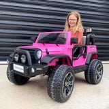 Grab the sunnies and get outside with the bubblegum pink kid-sized Jeep inspired ride on kids car. Complete with big high-grip rubber tyres, upgraded drive motors and a bigger battery, this 12v ride on is ready to navigate any rugged backyard terrain!