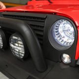 Providing your child with a realistic driving experience, this beauty also includes a foot pedal accelerator, working front lights, Built-in MP3 player, a horn (beep-beep!), bullbar and side-steps for easy access.
