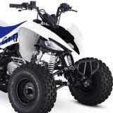 The quad bike has been embellished with amazing graphics and the lightweight frame is strong enough to resist manhandling and also minor impacts. There’s a front grill that provides optimal safety from head-on collisions. Moreover, the blue and white finish gives a stupendous look.